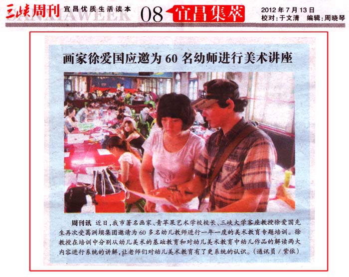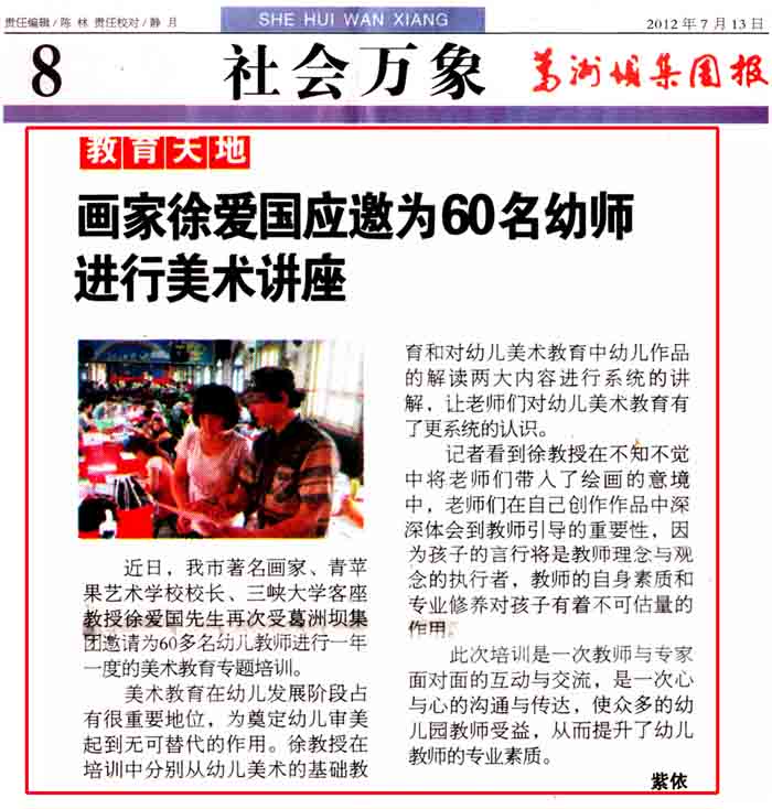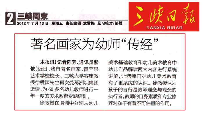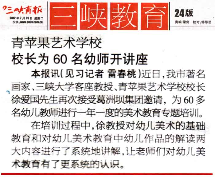 7月6日,三峡画院著名画家、三峡大学客座教授、宜昌市青苹果艺术学校校长徐爱国先生再次应邀葛洲坝集团为60多名幼儿教师进行一年一度的美术教育培训。