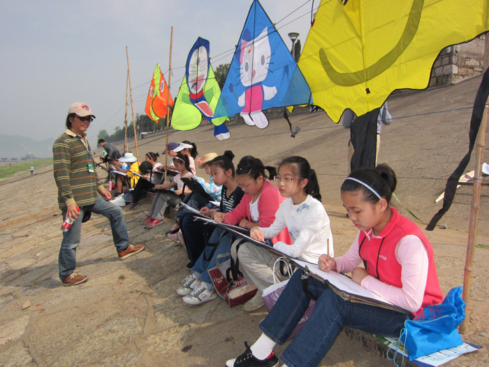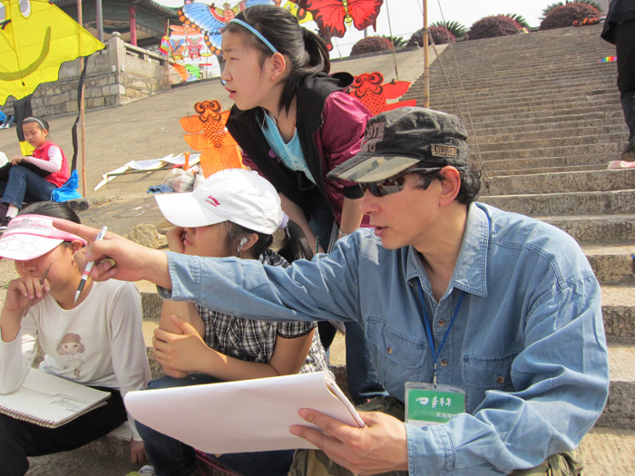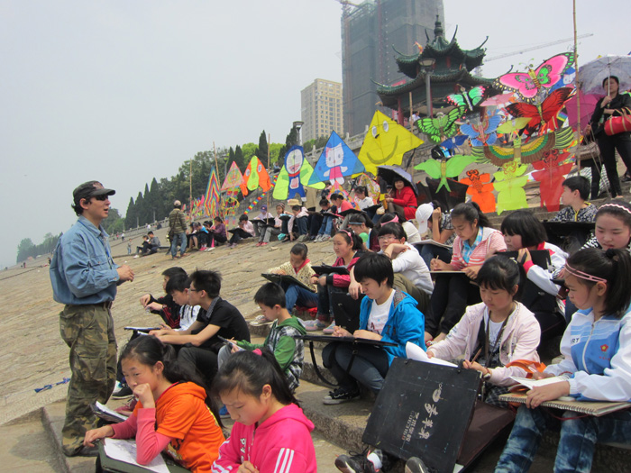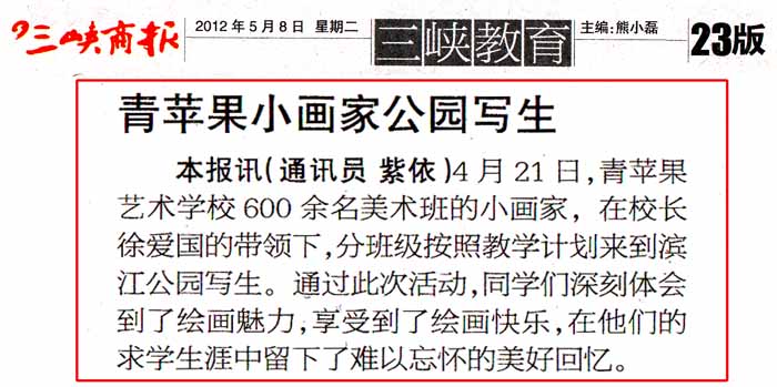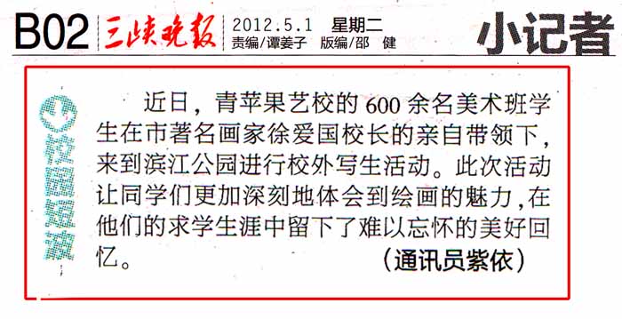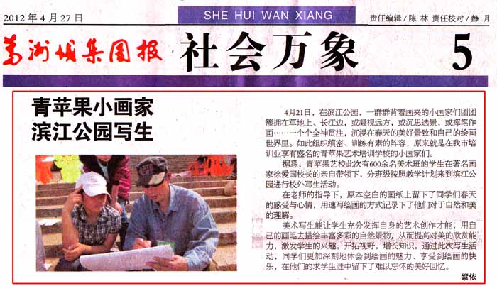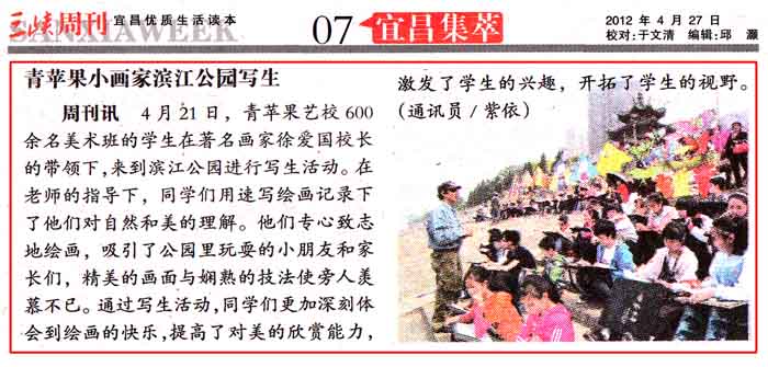 据悉,青苹果艺校此次有600余名美术班的学生在著名画家徐爱国校长的亲自带领下,分班级按照教学计划来到滨江公园进行校外写生活动。