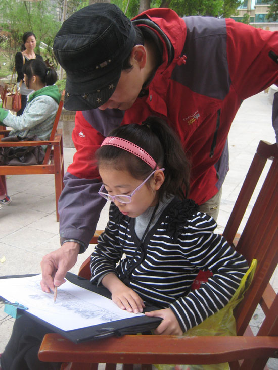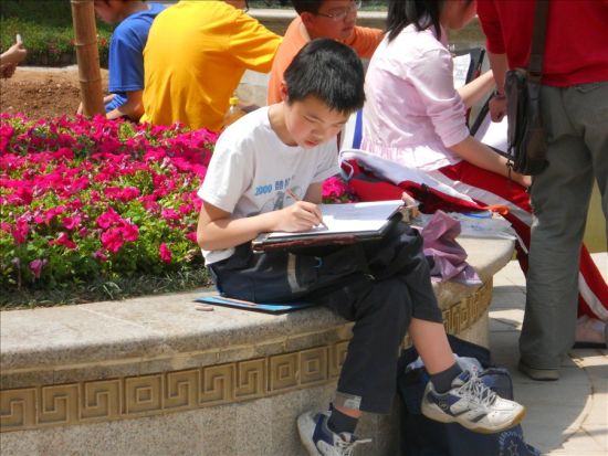只见小选手们各自摆出各自的架势,有的运用小蜡笔描绘;有的直接手握水彩笔在画纸上描绘青青绿地。