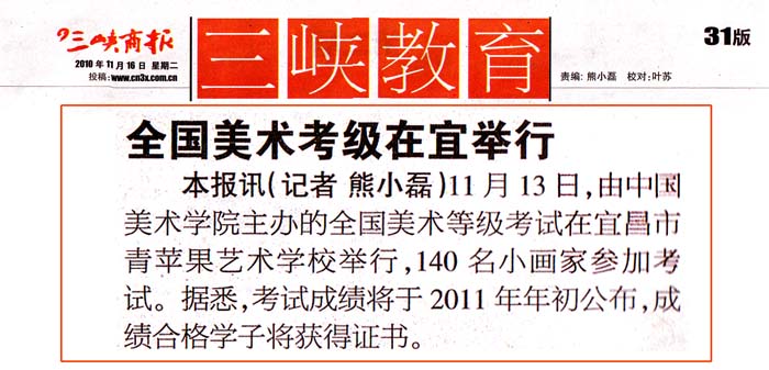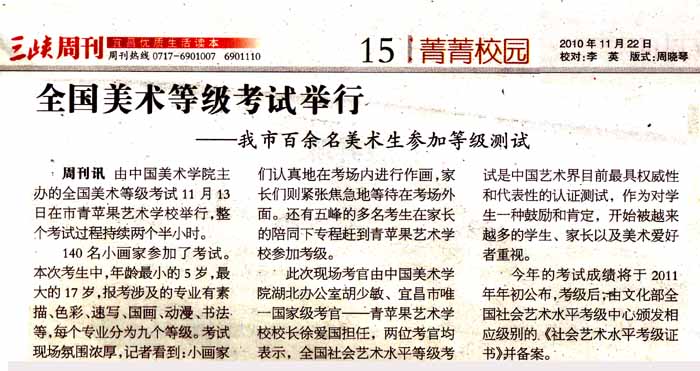 由中国美术学院主办的全国美术等级考试11月13日晚6点30分在宜昌市青苹果艺术学校举行,整个考试过程持续两个半小时。