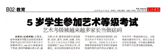 今年的考试成绩将于2011年年初公布,考级后,由文化部全国社会艺术水平考级中心颁发相应级别的《社会艺术水平考级证书》并备案。(张昊)