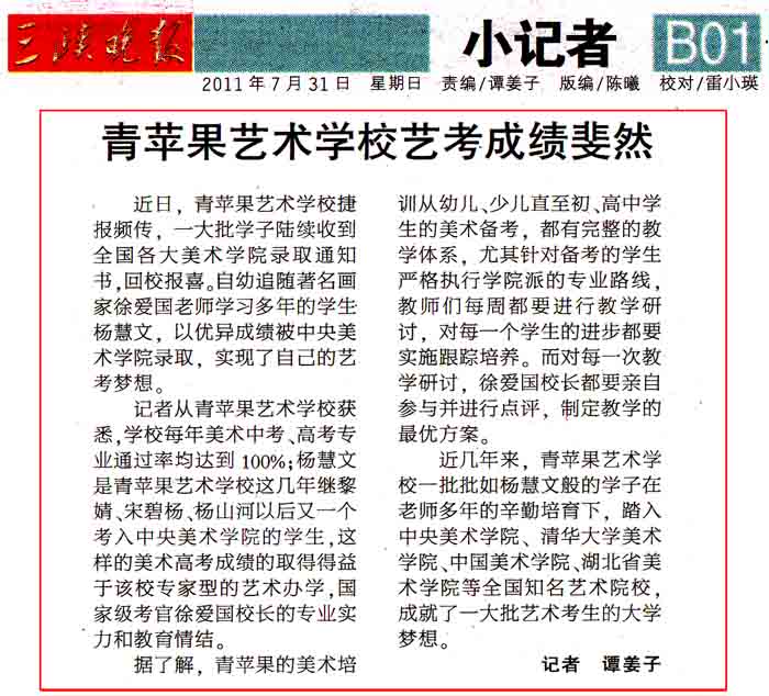 记者从青苹果艺术学校获悉,学校美术中考、高考专业通过率均达到100%;杨慧文同学是青苹果艺术学校这几年继黎婧、宋碧杨、杨山河以来又一个考入中央美术学院的学生,这样的美术高考成绩的取得得益于专家型的艺术办学,国家级考官徐爱国校长的专业实力和教育情结。从20年前创办的青苹果画室发展到现在拥有自己的教学基地、专业的教师团队、近千名学生规模的艺术培训学校。凭借先进的教学理念,明确的办学目标,锐意改革的精神和大胆创新的办学思路,创下了令人瞩目的办学业绩。