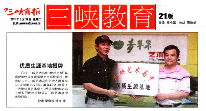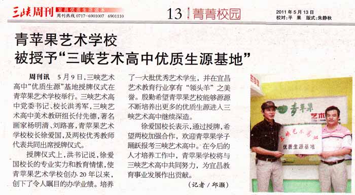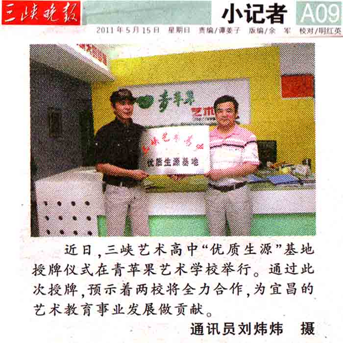 5月9日上午,三峡艺术高中“优质生源”基地授牌仪式在青苹果艺术学校举行。三峡艺术高中党委书记、校长洪秀军,三峡艺术高中美术教研组长付先德,著名画家杨明清、刘路喜,青苹果艺术学校校长徐爱国,及两校优秀教师代表共同出席授牌仪式。