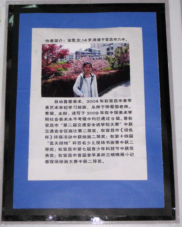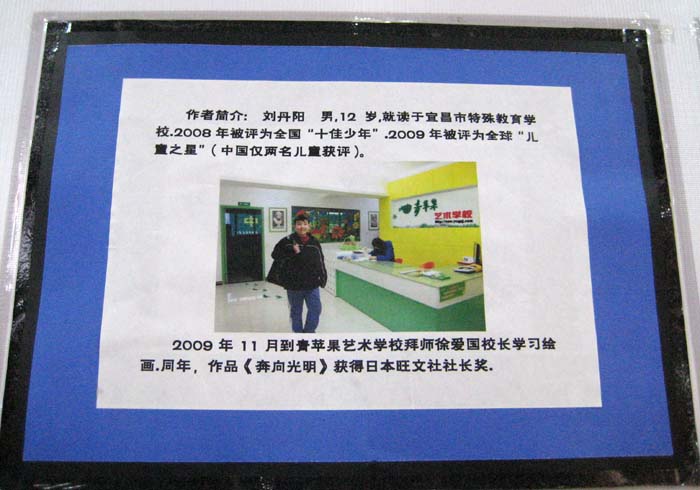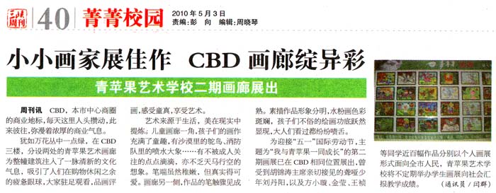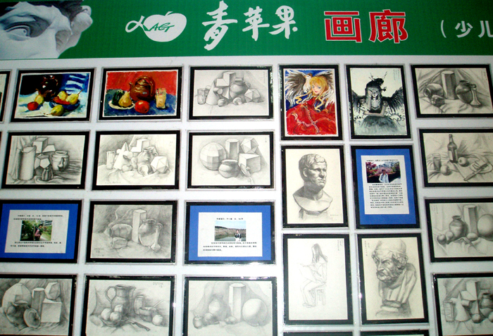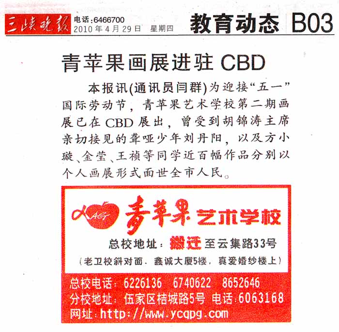 为迎接“五一”国际劳动节,主题为“我与青苹果一同成长”的第二期画展已在CBD相同位置展出,曾致信胡总主席的全国十佳少年刘丹阳,以及方小璇、金莹、王祯等同学近百幅作品分别以个人画展形式面世全市人民,青苹果艺术学校将不定期举办学生画展向社会汇报教学成绩。