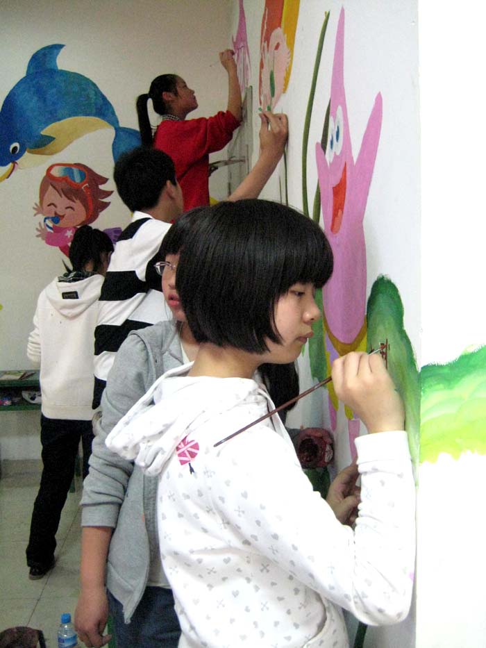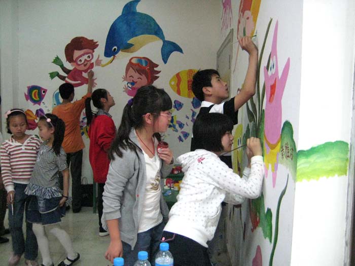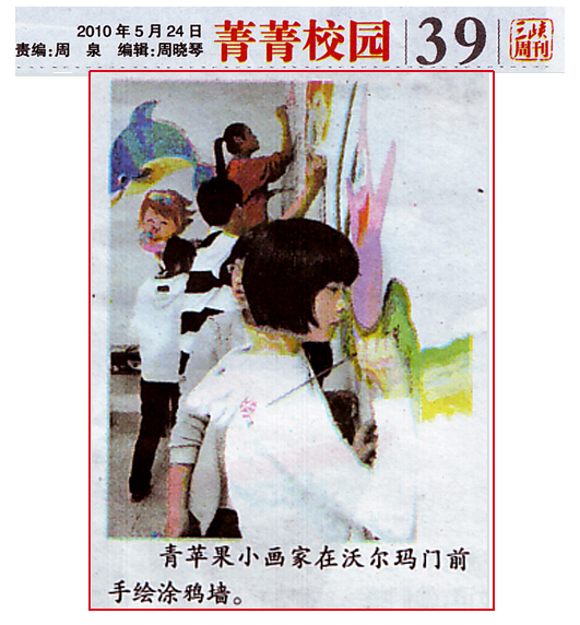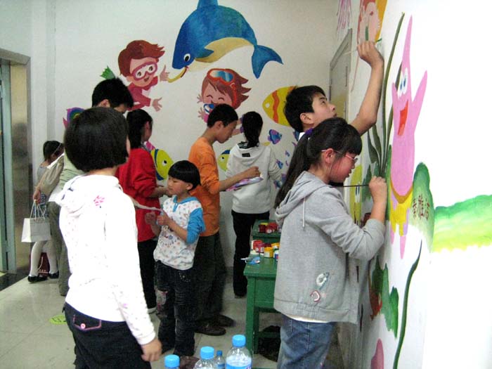 近日,青苹果艺术学校十余名小画家受邀来到CBD进行现场彩绘。不多时,一处主题为“海底世界”的纯手绘少儿涂鸦墙便豁然在沃尔玛超市出口,只见五彩斑斓的色彩将原本不起眼的一处空间打扮得分外夺目,与周围的“青苹果画廊”交相辉映,散发出浓厚的艺术气息。