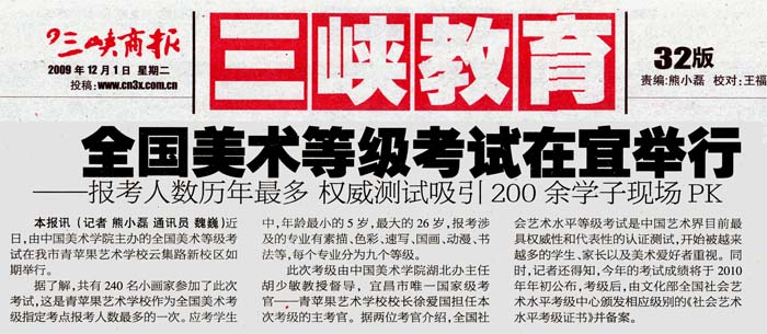 由中国美术学院主办的全国美术等级考试11月27、28日晚在宜昌市青苹果艺术学校云集路新校区如期举行。