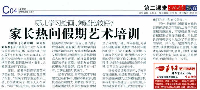 昨日,记者来到青苹果艺术学校看到,不少家长正忙着给孩子报名。“报晚了的学生还报不上名,上次就耽误了,孩子天天在家吵。”30岁的陈先生说。而陪女儿来报美术班的刘女士告诉记者:“孩子成绩不错,暑假我们想让她学点自己感兴趣的东西,女儿既想学美术又想学舞蹈,我们想到这些都能提高人的整体素质,就打算趁暑期满足孩子的愿望,听朋友介绍说这里教学质量好,后来多方一打听,口碑也很好,就来了。”