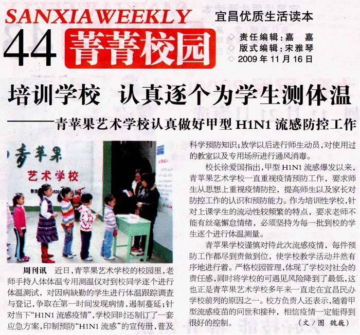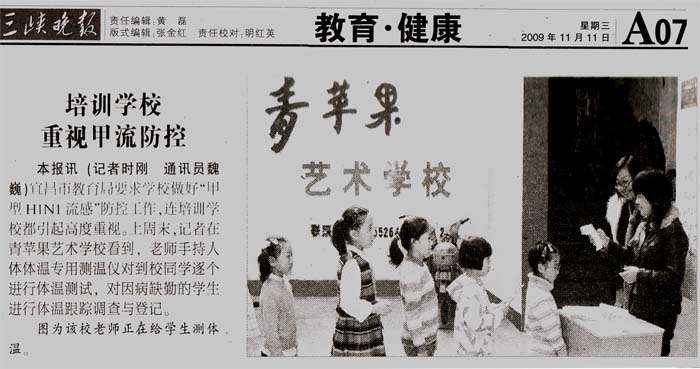 11月7日清晨,青苹果艺术学校的校园里,老师手持人体体温专用测温仪对到校同学逐个进行体温测试,对因病缺勤的学生进行体跟踪调查与登记,争取在第一时间发现病情,遏制蔓延;针对当下“H1N1流感”,学校同时还制订了一套应急方案,印制预防“H1N1流感”的宣传册,普及科学预防知识;放学以后进行师生动员,对使用过的教室以及专用场所进行通风消毒。
