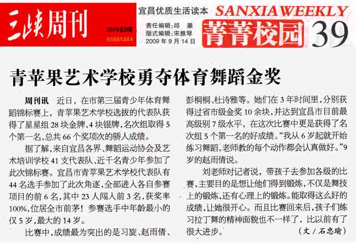 近年来,拉丁舞在青苹果艺术学校发展很快,特别是少儿拉丁舞。如今,参加拉丁舞学习的孩子每年都在成倍增长,孩子们也在各种比赛中不断获奖。比赛中,成绩最为突出的是习旋、赵雨倩、彭桐桐、杜诗雅等。她们在3年时间里,分别获得过省市级金奖10余块,并达到宜昌市目前最高级别7级水平,在这次比赛中更是获得了名次组5个第一名的好成绩。“我从6岁起就开始练习舞蹈,老师教的每个动作都会认真做好。”9岁的赵雨倩说。