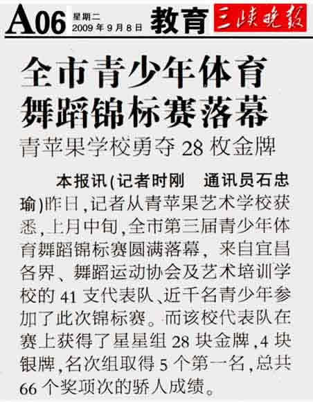 记者昨日获悉,在市第三届青少年体育舞蹈锦标赛上,青苹果艺术学校选拔的代表队获得了星星组28块金牌,4块银牌,名次组取得5个第一名,总共66个奖项次的骄人成绩。