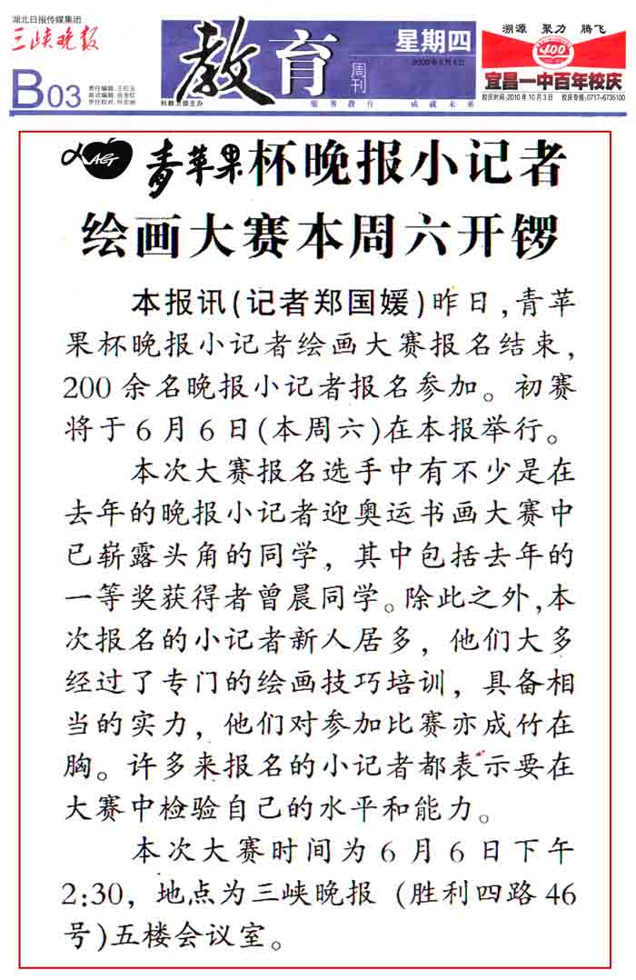 荆楚网消息 (三峡晚报) 活动目的:为庆祝建国60周年,配合本报举行的大型读者文化节活动,丰富晚报小记者文化生活,提高小记者的绘画水平,本报联合青苹果艺术学校举行现场少儿绘画比赛。通过初试将选拔100名优秀小画家届时参加夷陵广场现场决赛。
