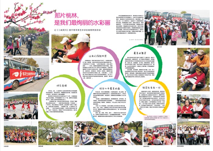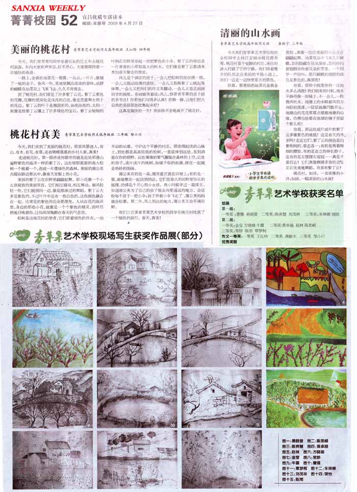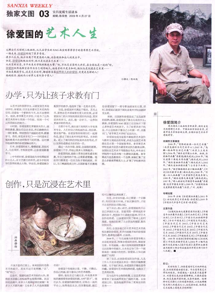 《 三峡周刊》2009年4月27日第18期5个整版报道青苹果艺术学校校长及桃花村采风活动盛况。封面人物—独家文图:徐爱国的艺术人生;28-29版—桃花村野游写生盛况;52版“菁菁校园”——青苹果艺术学校现场写生获奖作品展(部分)