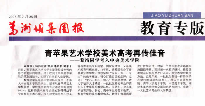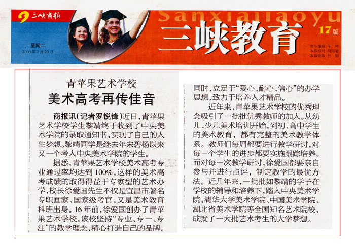 图为2008年7月29日《三峡商报》17版“三峡教育”——青苹果艺术学校美术高考再传佳音