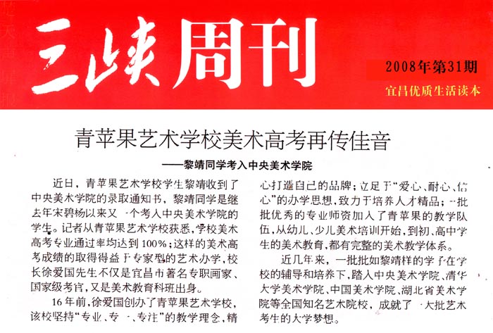 图为2008年第31期《三峡周刊》46版——青苹果艺校美术高考再传佳音