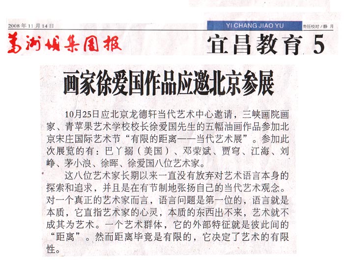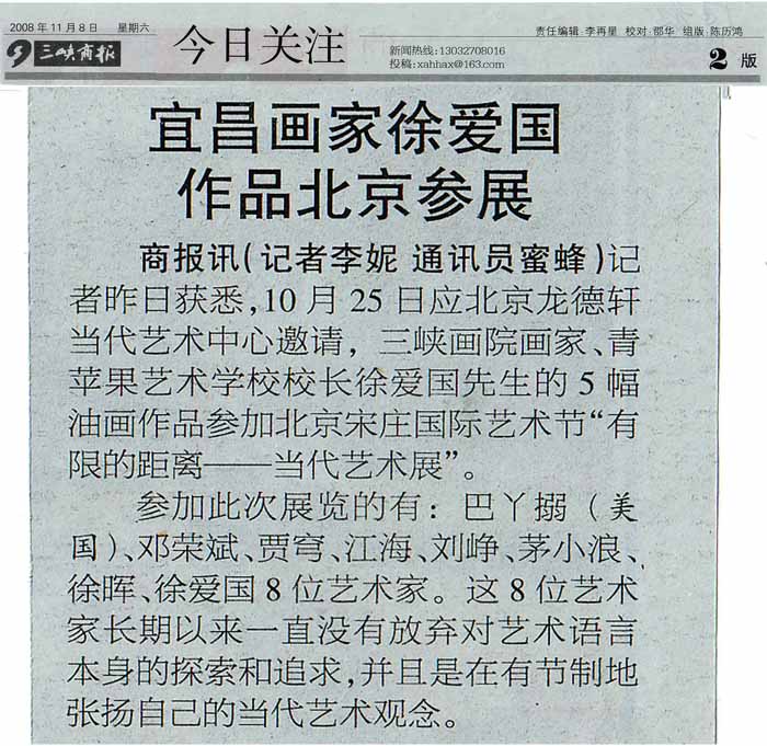 图为2008年11月8日《三峡商报》2版“今日关注”——宜昌画家徐爱国作品北京参展