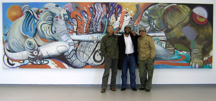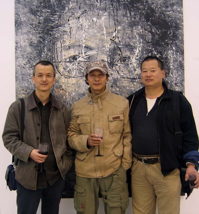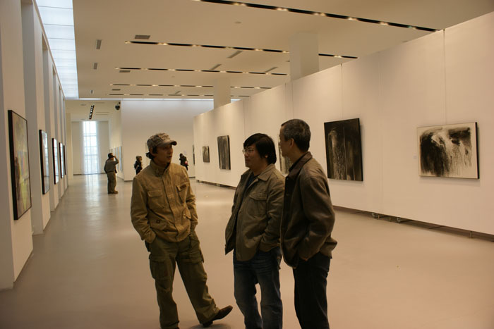 图为徐爱国先生与策展人茅小浪先生及美国艺术家巴丫搦在展览现场