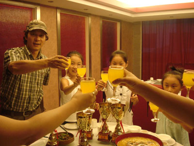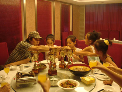 昨日,校长亲自到伍家分校为凯旋的学子接风洗尘,在燕莎大酒店宴请载誉归来的老师及获奖队员。