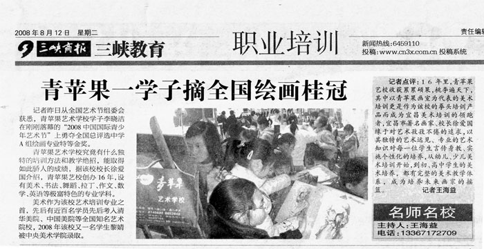 图为2008年8月12日“三峡图片网”青苹果学子获奖新闻报道