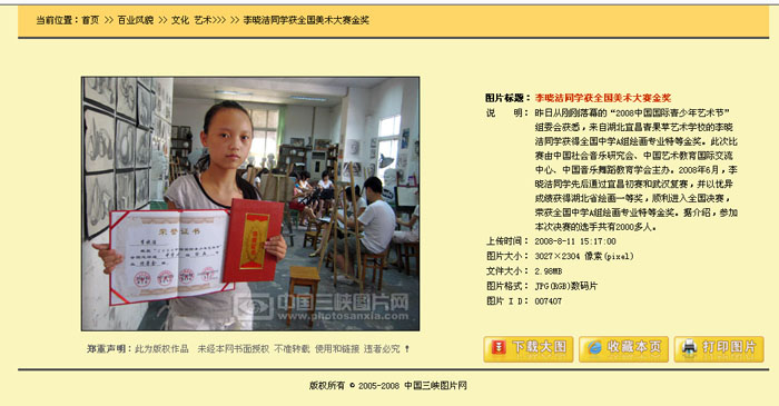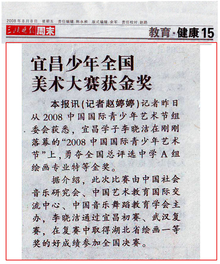 图为2008年8月8日《三峡晚报》15版“教育.健康”—宜昌少年全国美术大赛获金奖