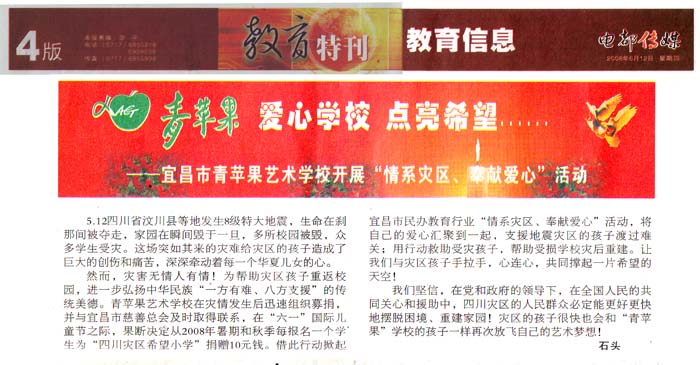 图为2008年6月12日《电都传媒》4版“教育特刊”——爱心学校、点亮希望……