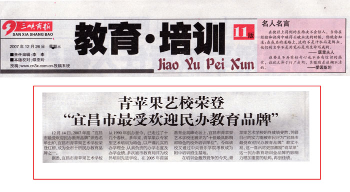 12月14日,2007年度“宜昌市最受欢迎民办教育品牌”评选名单出炉,宜昌市青苹果艺术学校荣登红榜,成为全市十所民办教育品牌之一。