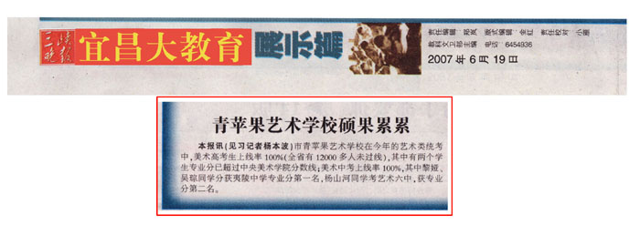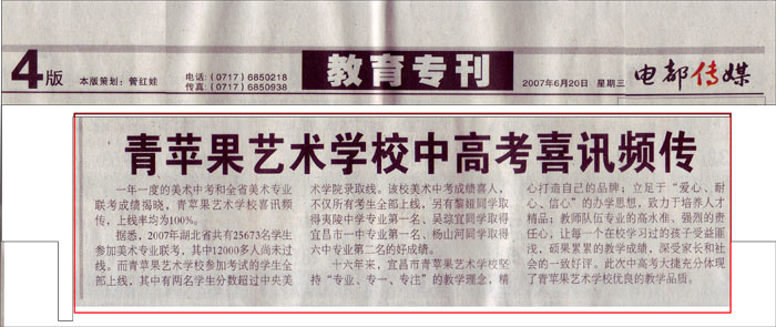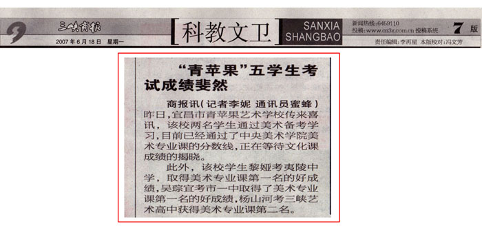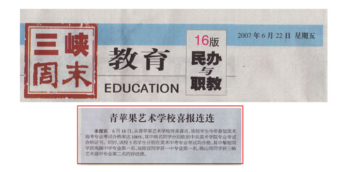 2007年6月22日《三峡日报》"三峡周末教育版"第16版新闻报道:青苹果艺术学校喜报连连。