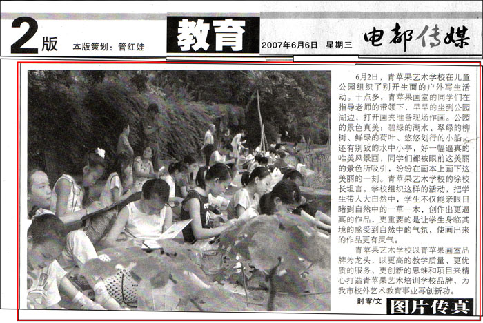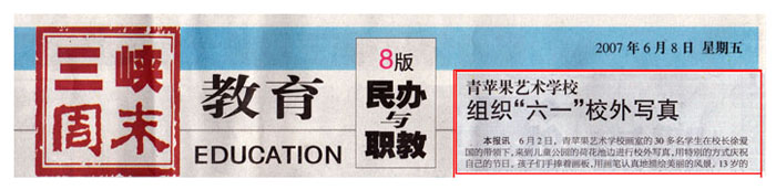 2007年6月8日《三峡日报》三峡周末教育版第8版——青苹果艺术学校组织“六一”校外写真。