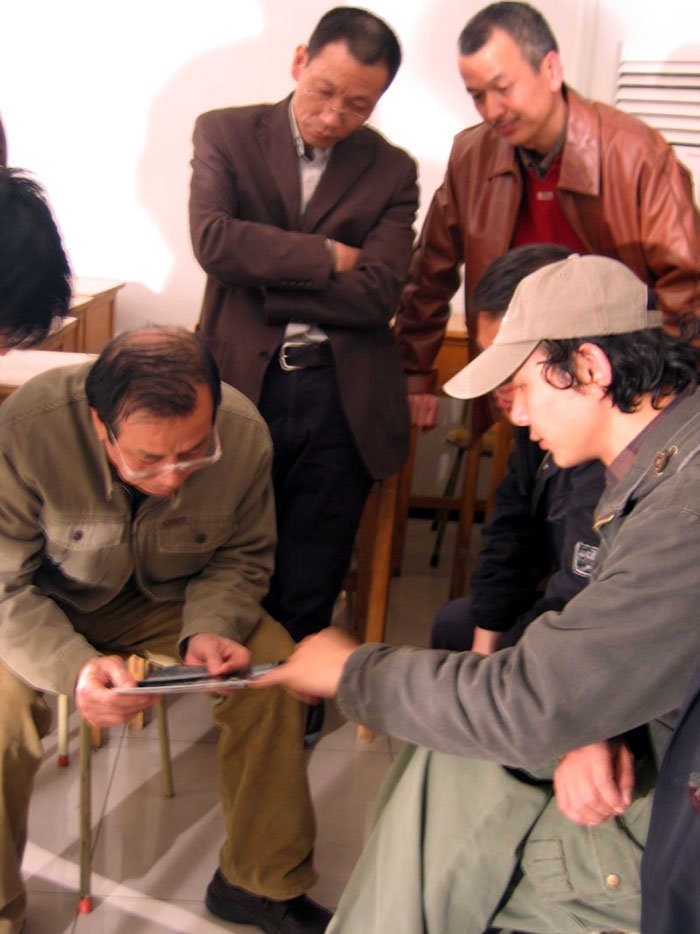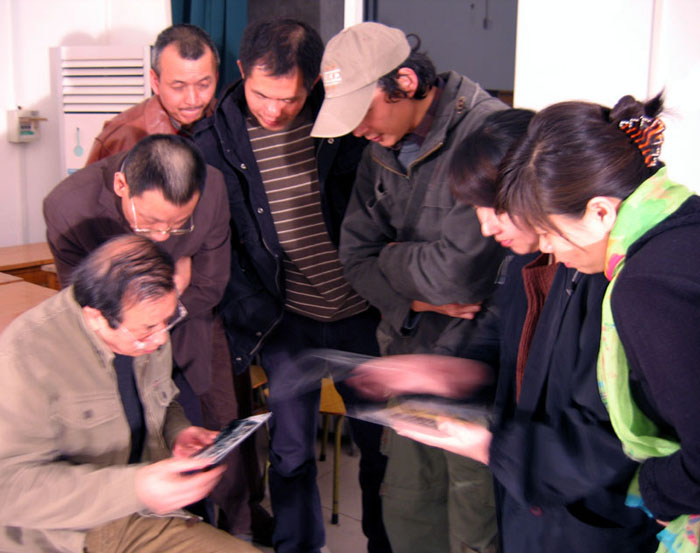 4月,正值春暖花开之时,徐爱国先生带着近期创作的油画作品来到北京——首都师大,再次聆听著名画家及恩师尚扬教授的教诲及指点。尚扬在肯定了作品同时也提出了改进性的意见。图为尚扬先生(左一)正在点评徐爱国(右一)近作。