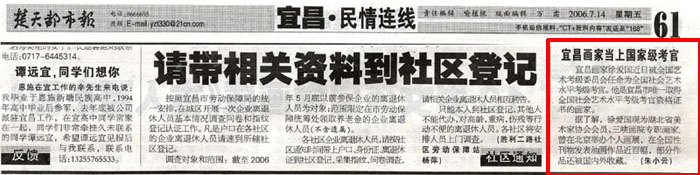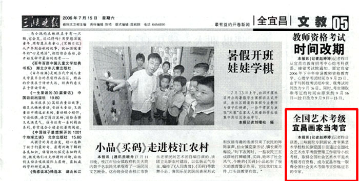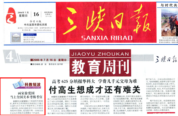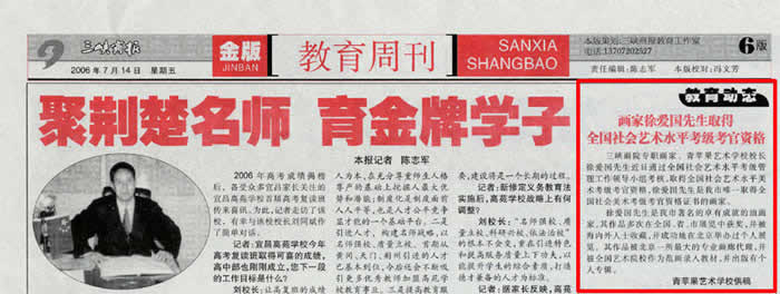 三峡画院专职画家、青苹果艺术学校校长徐爱国先生近日通过全国社会艺术水平考级管理工作领导小组考核,取得全国社会艺术水平美术考级考官资格,徐爱国先生是我市唯一取得全国社会美术考级考官资格证书的画家。