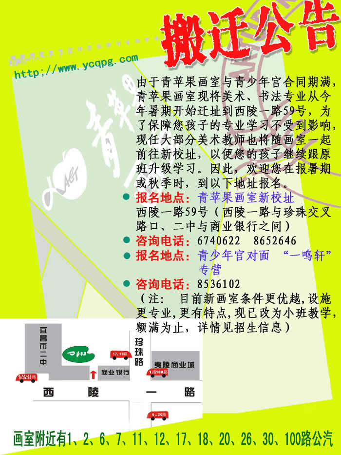 由于青苹果画室与青少年宫合同期满,青苹果画室现将美术、书法专业从今年暑期期开始迁址到西陵一路59号,为了保障您孩子的专业学习不受到影响,现任大部分美术教师也将随画室一起前往新校址,以便您的孩子继续跟原班升级学习。因此,请您在报暑期或秋季时,到以下地址报名。