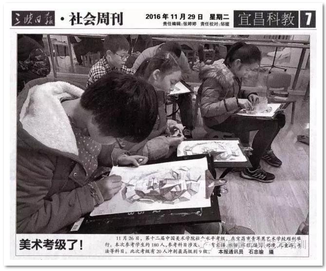 2016年11月26日,第十二届中国美术学院社会水平考级,在宜昌市青苹果艺术学校顺利举行,青苹果艺术学校作为授牌的全国美术考级培训基地及考区,已经成功的举办了十一届考级。累计参加考级人数达3200多人。