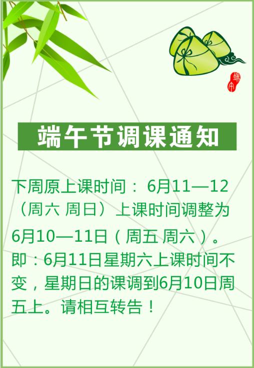 下周原上课时间: 6月11—12(周六 周日)上课时间调整为6月10—11日(周五 周六)。即:6月11日星期六上课时间不变,星期日的课调到6月10日周五上。请相互转告!