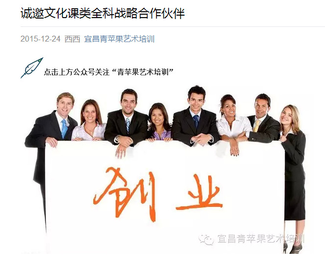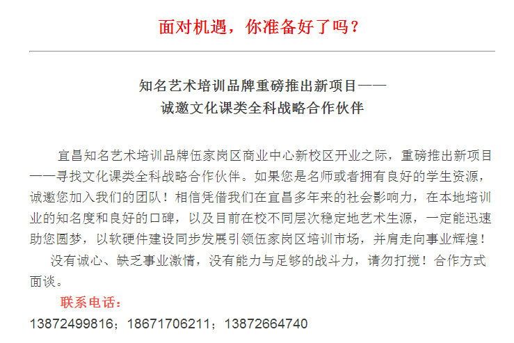 宜昌知名艺术培训品牌伍家岗区商业中心新校区开业之际,重磅推出新项目——寻找文化课类全科战略合作伙伴。如果您是名师或者拥有良好的学生资源,诚邀您加入我们的团队!相信凭借我们在宜昌多年来的社会影响力,在本地培训业的知名度和良好的口碑,以及目前在校不同层次稳定地艺术生源,一定能迅速助您圆梦,以软硬件建设同步发展引领伍家岗区培训市场,并肩走向事业辉煌!