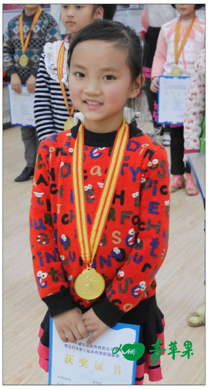 记者在现场看到,一个叫秦娅茜的小女孩,今年才5岁多,非常聪明可爱,甜甜地笑容总是挂在脸上,她是参赛选手中年龄最小的,虽然家住江南艾家镇,每次上课过江挺不容易,特别是夏天涨大水,她们得绕好大一圈,才能到学校,尽管到学校距离遥远,却从未因此阻挡她对舞蹈的热爱,在家长的重视和给力支持下,一起克服重重困难,坚持到青苹果艺术学校学习跳舞,在此次比赛中,夺得了伦巴、恰恰舞2枚金牌的好成绩。家长很欣慰,不停地感谢学校对她孩子的辛勤培育。