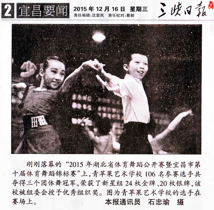 日前,从刚刚落幕的“2015年湖北省体育舞蹈公开赛暨宜昌市第十届体育舞蹈锦标赛”上传来喜迅,青苹果艺术学校参赛选手在激烈角逐中脱颖而出,取得了优异成绩,共夺得三个团体舞冠军,在单项比赛中也斩获多枚奖牌,共荣获了新星组24枚金牌,20枚银牌。不同组别中11个第一名、13个第二名、8个第三名,5个第四名,4个第五名,1个第六名的好成绩,比赛总成绩位于全省前列,青苹果艺术学校也因此被组委会授予优秀组织奖。