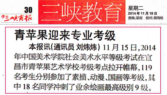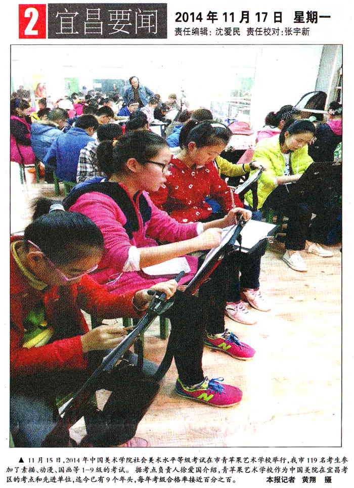 11月15日,2014年中国美术学院社会美术水平等级考试在宜昌市青苹果艺术学校考级考点如期举行,来自本校及社会各界美术爱好者119名考生分别参加了素描、动漫、国画等1—9级的考试,有18名同学冲刺业余绘画最高级别9级。