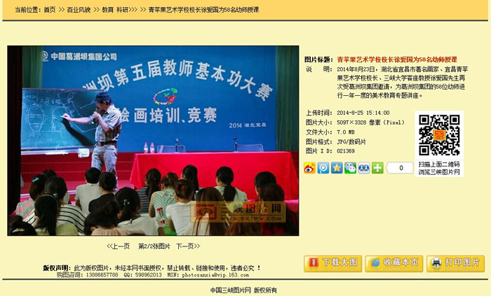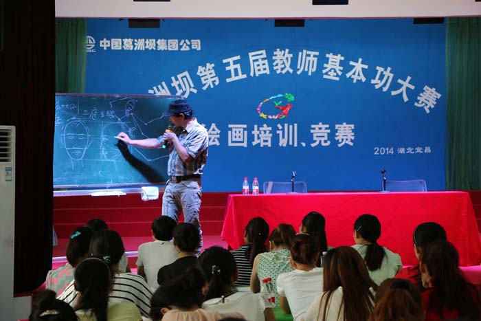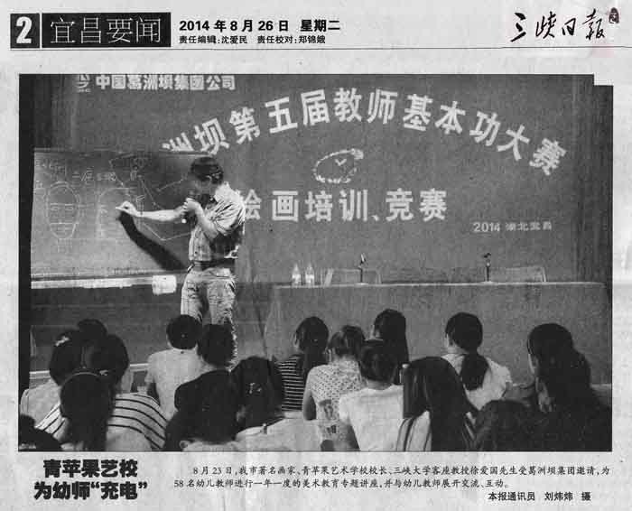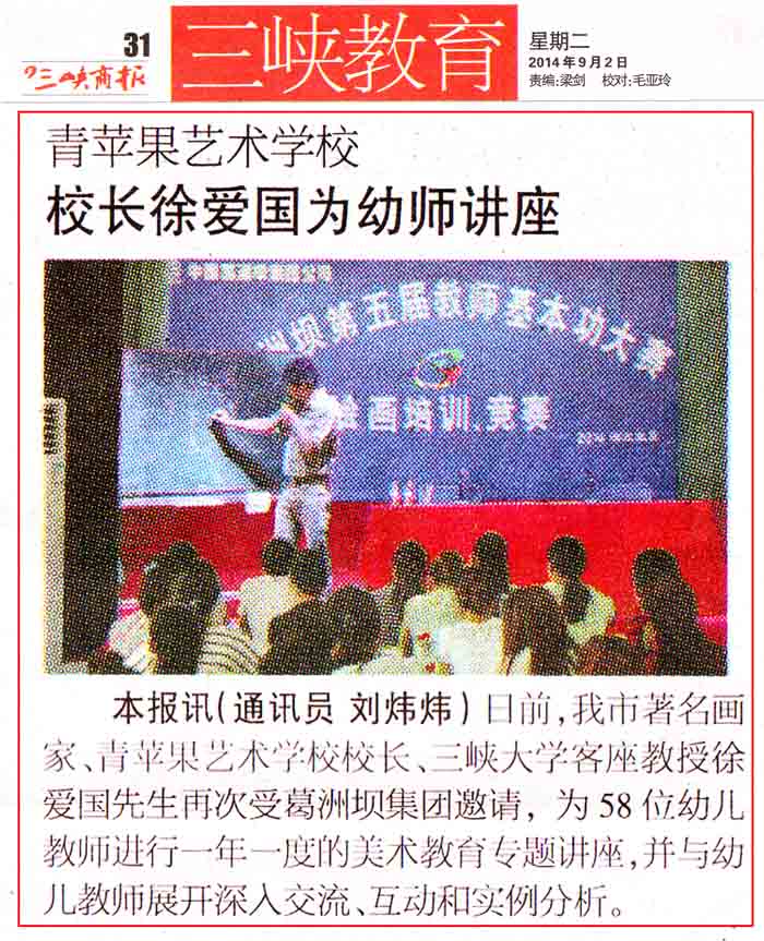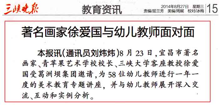 2014年8月23日,我市著名画家、青苹果艺术学校校长、三峡大学客座教授徐爱国先生再次受葛洲坝集团邀请,为58名幼儿教师进行一年一度的美术教育专题讲座,并与幼儿教师展开深入交流、互动和实例分析。