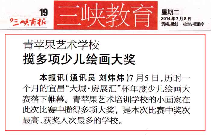7月5日上午,由宜昌市玖加壹文化发展有限公司主办的《我爱我家》“大城•房展汇”杯年度少儿绘画大赛,历时一个月后终于落下帷幕,颁奖典礼在CBD负一楼隆重举行,青苹果艺术培训学校的小画家在此次比赛中揽多项大奖,是本次比赛中奖次最高、获奖人次最多的学校之一。